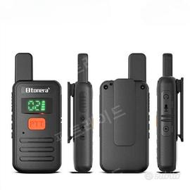 Coppia di mini-walkie talkie Btonera T1. Piccolissima e leggerissima, bidirezionale, sta in una mano ed è facile da trasportare e ha due comodi pulsanti PTT (uno laterale ed uno frontale). Nonostante le dimensioni ha tutte le caratteristiche di potenza, buona ricezione e durata di un normale ricetrasmittente PMR446, ottima quindi per lavoro, sport ed hobby e può essere ricaricata tramite USB C. Portata: 3km Intervallo di frequenze: 400-470MHz Numero Canali: 16 Modello: T1 Certificazione: Ce Potenza di uscita: 3W Capacità della batteria: 1050mAh Dimensioni (escl.antenna): 87x48x18mm Attacco tipo Kenwood/Baofeng peso: 75g Colore: nero-arancio Il pacchetto include: - 2 radio con batteria - 2 caricabatterie USB - 2 adattatori spina USA - 2 cavi di ricarica USB C - 2 clip da cintura - 2 laccetti da collo N.B.: già programmate con i 16 canali liberi PMR446 (di solito quelle reperibili sui siti online non sono programmate con le frequenze legali in Europa). Posso fornire (su richiesta) cavo altoparlante-microfono e/o cavo auricolare-microfono.