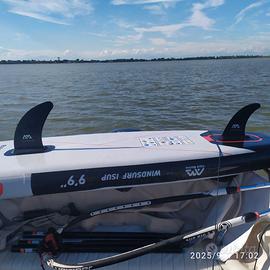Tavola gonfiabile molto robusta e rigida, con scassa per albero, 2 pinne, pagaia , pompa doppia azione , rig completo (piedino, albero in 4 pezzi, boma in due pezzi allungabile ,vela 2,5 mq). Ottimo per imparare o per alternare la voga con la vela.
