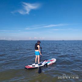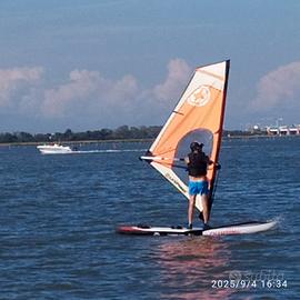 Tavola gonfiabile molto robusta e rigida, con scassa per albero, 2 pinne, pagaia , pompa doppia azione , rig completo (piedino, albero in 4 pezzi, boma in due pezzi allungabile ,vela 2,5 mq). Ottimo per imparare o per alternare la voga con la vela.