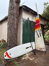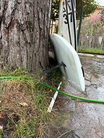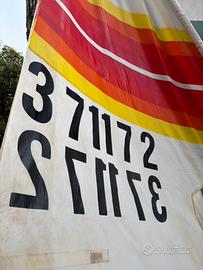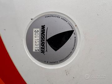 Set completo, ottimo stato Vendo windsurf storico modello Windsurfer Original (licenza Windsurfing international Europe) , un vero pezzo da collezione o per amanti del "One Design". La tavola è completa di tutto il necessario per scendere in acqua o per essere esposta. Il set include: • Tavola: Volume generoso, iconica livrea bianca con strisce arancio/gialle. • Vela: Originale con numero velico 371172, colori brillanti (modello sunset). • Boma: Originale in alluminio/plastica nera. • Deriva e Pinna: Incluse e funzionali. • Albero: Presente (anche se non visibile interamente in foto).