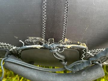 Vela usata in acqua dolce, riparazione fatta sul manipolo da un professionista regge ma ha un difetto di cui allego foto. Sacca porta vela.