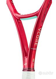 Con questo aggiornamento 2026, ottavo della serie Vcore, Yonex apporta modifiche incrementali al telaio, mantenendo la sensazione morbida, lo spin e la potenza che hanno fatto la fortuna di questo telaio. Come gli altri modelli della linea VCORE, la forma isometrica della testa è stata modificata con una zona di contatto più ampia, ottenendo una maggiore finestra di spin insieme a una potenza più facile e un angolo di lancio più alto. Con un'inerzia intorno ai 320, la VCORE 100 offre una stabilità eccellente, pur garantendo una velocità sufficiente su tutto il campo per attaccare la rete e chiudere i punti. Per il 2026, Yonex ha riprogettato il telaio, conferendogli una forma più veloce e aerodinamica e allo stesso tempo rinforzandolo i punti chiave per una maggiore stabilità e potenza. Ulteriori aggiornamenti per il 2026 includono l'allargamento dei fori dei passacorde per migliorare l'attrito delle corde, nonché l'allungamento della scanalatura interna sulla punta per una maggiore flessibilità. Come nella versione precedente, questa racchetta integra una pellicola sottile ed elastica (Servo Filter) tra gli strati di 2 NAMD FlexForce Graphite, che consente alla racchetta di flettersi in modo ottimale assorbendo al contempo le vibrazioni indesiderate. Questa racchetta è inoltre dotata di una rete anti-vibrazioni, integrata nel manico per migliorare ulteriormente lo smorzamento. Ideale per i giocatori di livello intermedio e avanzato che cercano una racchetta morbida e potente con un potenziale di spin impressionante. Caratteristiche Tecniche: Ovale: 100 in2 / 645 cm2 Lunghezza: 27in / 68,5cm Peso non incordata: 300g/10,6oz Bilanciamento non incordata:32cm/7 pts HL Inerzia:325 Rigidità: 65 Spessore del telaio: 24mm / 26mm / 23mm Materiale:2G-Namd FlexForce/H,M, Graphite Colori:Rosso Grip: Yonex Synthetic Schema corde: 16 Vert. / 19 Oriz. Salto: 7T,9T,8H Il telaio esce senza corde ma è possibile incordarlo con qualsiasi corda presso il nostro Tennis Lab
