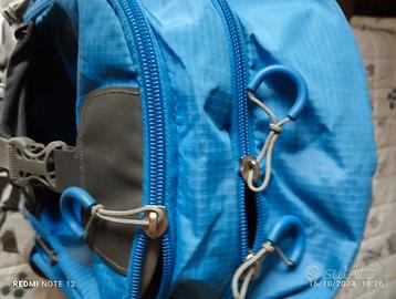 Zainetto blu grigio per trekking. Comodissimo con varie tasche anche quelli laterali per bottiglie d'acqua.