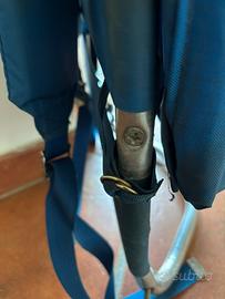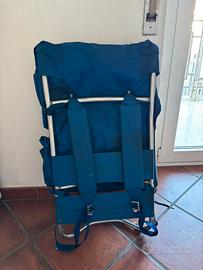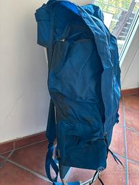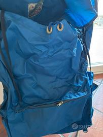 Zaino con telaio esterno in alluminio con sacca base sotto, sacca sopra, due sacchette laterali per ogni lato, busta sulla dacca superiore. Spallacci imbottiti e regolabili. Adatto per carichi anche pesanti mantenendo la schiena dritta. Ottimo per campeggio: sacco a pelo sotto nell’incavo del telaio, vestiti sacca di sotto e tenda sacca di sopra. Condizioni buone ad eccezione di un laccio sotto da ricucire (vedi ultima foto), ma si puó usare anche così l’ho fatto per anni. Consegno a Roma zona Ponte Milvio - non spedisco perchè ingombrante.