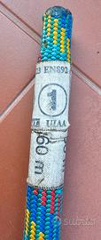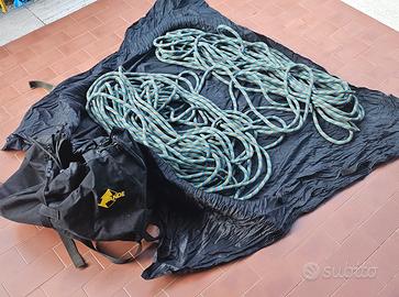 Articolo della marca Ande in buone condizioni, usato al massimo per 10 uscite: zaino con telo proteggi corda da appoggiare a terra affinché non si bagni la corda stessa. Contiene 60 m di corda da arrampicata. Segnalo soltanto che lo zaino ha bisogno di una rinfrescata. Vendita da privato, no garanzia.