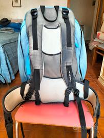 Zaino Quechua da 50 litri per trekking, alpinismo, campeggio e turismo, leggero e resistente all' acqua, di 2 colori azzurro e celeste, con 2 ampie tasche laterali, taschino interno per portafoglio e documenti, taschino e rete all' esterno. In buono stato di manutenzione. Usato pochissimo.