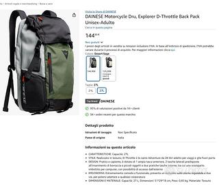 vendo NUOVISSIMO ZAINO DAINESE Mod. DESERT SAGE 27 litri - Motorcycle Dru, Explorer D-Throttle Back Pack- ancora con cartellino attaccato e borsa dainese disponibili foto dettagliate -adattissimo anche per esser regalato . CARATTERISTICHE: Capacità: 27L STILE: Realizzato in tessuto, D-Throttle è lo zaino Adventure da 27 litri adatto per viaggi e gite fuori porta DESIGN: Pratico e capiente, è dotato di 1 ampia tasca anteriore, 2 tasche laterali predisposte all’inserimento di borraccia o piccoli oggetti e due pratiche tasche interne, tra cui uno scomparto imbottito per computer, con possibilità di accesso dall’esterno ERGONOMIA: Estremamente comodo e funzionale, presenta un cinturino sullo sterno regolabile a due vie, per potersi adattare a qualsiasi corporatura DIMENSIONI E MATERIALE: Capacità: 27 L, Dimensioni: 51*29*18 cm, Peso: 0,45 kg Ritiro a mano al mio domicilio o spedizione da pagarsi e concordare a parte. N.B.: nel caso di vendita a distanza che necessita spedizione, la trattativa è gestita direttamente (non con il servizio “tuttosubito” e non inviatemi proposte acquisto tramite l'opzione dedicata del sito), pagamento con bonifico anticipato oppure paypal (+ spese commissioni )