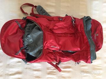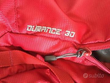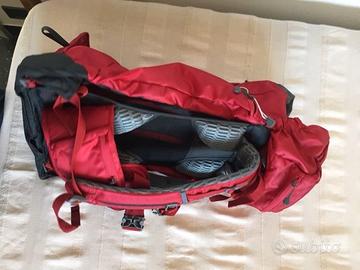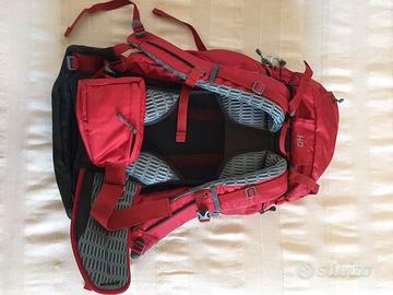 Zaino da trekking, rosso, da 30 litri come nuovo, usato una sola volta. Vendo per riduzione dell'attività escursionistica dovuta all'età. Lo zaino ha schienale ventilato con distanziali in alluminio e appoggi e spallacci traspiranti. Tela leggera e robusta. Tante tasche, sopra a cappuccio, due laterali, una al centro, una al fondo da cui si accede al contenuto interno, una nella cintura . Sistema per dissetarsi. Lacci per bastoncini. Copertura antipioggia.