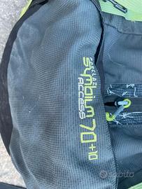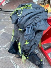 Zaino da trekking Decathlon molto capiente, con schienale regolabile e sacco antipioggia.
