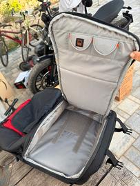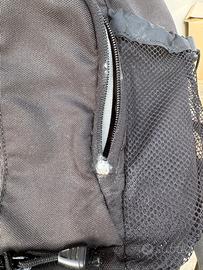 Lo zaino è usato ma tenuto bene. Manca solo una zip ma non pregiudica assolutamente l’uso in quanto in quella cerniera ce ne eranonpreviste due.