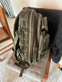 Zaino miltec di colore Ranger green, litraggio di 25l, è comperto di passanti M.O.L.L.E. E cinnghie per la compressione di quello che puoi tenere all’interno, ho dovuto farlo riparare dal sarto per via dello schiacciamento con conseguente rottura della clip sinistra dello zaino dunque potete notare la differenza di colore delle cuciture.