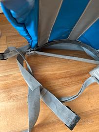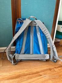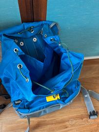 Zaino marca Ravelli made in Trento, vintage, tenuto ottimamente usato pochissimo, resistente, color azzurro limpido del cielo di montagna, una grande tasca con zip davanti, una tasca gande con zip sul coperchio, spallacci e finiture grigie, altezza cm. 43, profondità sul lato cm. 20 ma all’interno c’è lo spazio del telaio rigido che sostiene lo schienale per assicurare il circolo d’aria, tasca interna senza zip sul lato schiena, altre 2 tasche interne senza zip tipo porta borracce