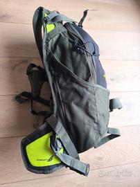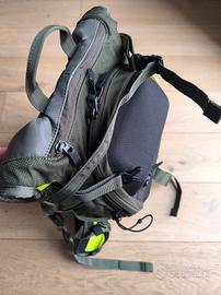 Zaino da sci alpinismo leggero con attacco per gli sci e scomparti extra per riporre altri oggetti. Zaino leggero Montatura del casco Attacco sci e snowboard Inserto per sonda e pala Ottime condizioni Colore verde militare con inserti fluo Schienale ergonomico e traspirante Protezione rigida frontale (tipo guscio) Tasche multiple + vano principale capiente Cinghie regolabili e chiusura in vita. Ideale per scialpinismo ma anche moto, bici, trekking.