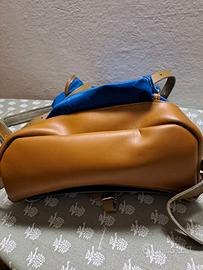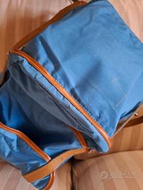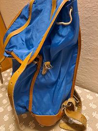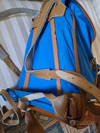 Zaino sportivo di colore azzurro in materiale impermeabile e base di cuoio, come pure di cuoio le finiture e le cinghie. Dotato di leggero telaio in metallo rivestito per proteggere il dorso e una tasca sul davanti. Utile per le passeggiate, ma anche come borsa da città capiente, data la presenza delle sue ottime finiture. Mis. base in cuoio 30x15; alt. 37; larg.37.