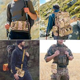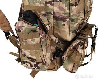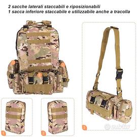 Zaino tattico militare camoufage/mimetico, con capienza 45/50 litri, modulabile con sistema molle, spallacci imbottiti, cintura lombare e pettorale, 2 sacche laterali staccabili e una borsa grande staccabile e utilizzabile anche a tracolla.