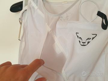 Zaino trail running Dynafit, misura spalle 33 cm, 2 tasche anteriori, ampia tasca (zaino) sulla schiena. Con scritta ''Sellaronda skimaraton" sulla schiena.