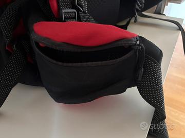 Lo zaino è suddiviso in 2 zone, oltre ad avere delle piccole tasche in vita. Ha inoltre la regolazione dell’altezza sulla schiena