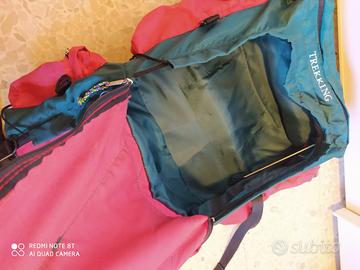 Vendo, causa inutilizzo, zaino trekking uomo con telaio in alluminio e con le seguenti misure: altezza 68 cm, larghezza 45 cm circa (difficile misurarlo con le tasche), spessore 22 cm. Facendo i conti con le seguenti misure DOVREBBE essere da 60 litri, più lo spazio per il sacco a pelo e l'eventuale materassino.