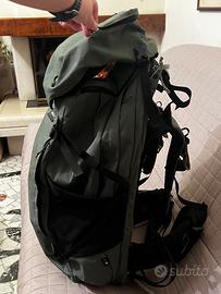 Zaino viaggio capiente Forclaz Travel 900 con apertura stile valigia e con 13 tasche. Dispone di uno zainetto estraibile da 6 litri e di copertura anti pioggia.