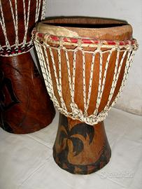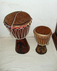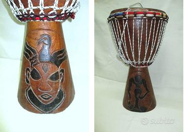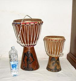 Vendo 2 Djambé, uno enorme l'altro di misure medie, necessitanti di nuova installazione di pelle (reperibile). Presenti ancora i tiranti. Bellissimi gli intarsi e i decori tipicamente etnici. Ottimi anche per nuova invenzione come oggetti d'arredo o complementi per giardini o luoghi di ristoro. I tiranti e gli elementi sono tranquillamente sfilabili. Vendo in coppia per 26 euro