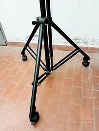 3 Aste microfoniche professionali con giraffa telescopica, ruote frenanti e pivottanti da Ø 50mm. Adatta per studi di registrazione ed eventi "live". Dotata di snodo superiore e contrappeso regolabili in acciaio per un'ottimale regolazione e bilanciamento. Base tripoide e manicotto di regolazione dell'altezza in nylon. Gambi in acciaio pieno con doppia barra di collegamento per assicurare una maggiore stabilità. Dimensione base: Ø 1060mm Altezza minima: 1510mm Altezza massima: 24000mm Peso: 12 kg Colore: Nero opaco Giraffa telescopica: 1400 / 2350mm. Materiale mai usato di cui 2 ancora negli imballi originali, solo ritiro a mano a Roma Monteverde.