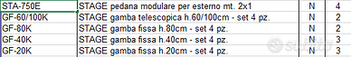 4 Pedane modulari STA750 per palchi mobili dimensioni 200x100 spessore cm. 9,8 cm + vari set di gambe da 20 a 100cm. per poter assemblare palchetti o pedane di varie altezze. Alluminio + Multistrato 22 mm. Classe 1 ignifuga e antiscivolo. portata certificata 750 kg/m2. Peso 38 kg x una senza gambe. Vendo solo in blocco.