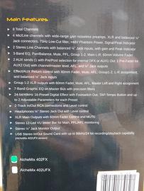 La serie di mixer AlcheMix è stata ideata per soddisfare le esigenze di musicisti e operatori dello spettacolo che necessitano di strumenti affidabili e professionali per spettacoli dal vivo, sale prova, scuole di musica, home-recording, ecc. L’architettura di questi mixer a 2-Bus prevede 2 sottogruppi, 2 mandate AUX (una Pre/Post-Fader; l’altra Pre-Fader fissa). Tutti i canali offrono EQ a 3-bande, MUTE, PFL/AFL, assegnazione SUB e Main. Un EQ grafico a 7-bande sulle uscite principali con filtri di precisione e un Effetto Digitale a 48kHz/24-bit completano il set di strumenti a disposizione dell’utente. Il multi effetto digitale prevede 16 tra i preset più usati (reverberi Hall-Room-Plate, Delay-Eco) e permette di modificare fino a due parametri con il tasto Tap-Tempo. La linea è composta da 4 modelli: Alchemix 402FX, 402UFX, 602UFX e 802UFX con 4, 6 e 8 preamplificatori Mic/Line a basso rumore. I modelli 402-602-802UFX montano inoltre una scheda audio USB Stereo 2-In/2-Out per la registrazione/riproduzione su PC/Mac fino a 96kHz/24-bit.