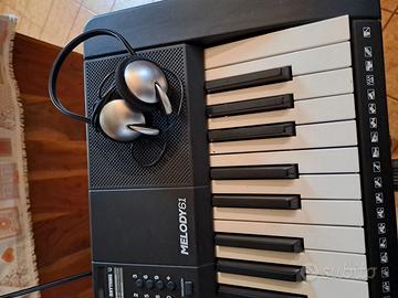 Tastiera musicale portatile con 61 tasti, Include un supporto facile da montare, cuffie, leggio. Centinaia di suoni elettronici; 300 voci, tra cui: Piano acustico, piano elettrico, archi, organo, synth, batteria e altri ancora. Dimensioni: profonda 31,5 x larga 94,8 x alta 10,5 cm