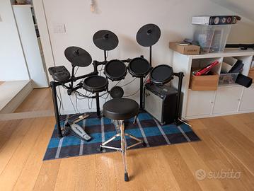 Batteria elettronica completa Pad dinamici e confortevoli per una risposta naturale 8" Pad in gomma (rullante di alta qualità bi-zona, tre tom a zona singola) Torre pad cassa con pedale grancassa incluso Piatti 10": Ride, hi-hat, crash w / choke Solido rack in alluminio per stabilità e flessibilità Cavi di collegamento, bacchette, chiave per i pad e cavi di alimentazione inclusi Modulo elettronico Nitro 40 kit classici e moderni, 385 suoni di di batteria e piatti 60 tracce integrate su cui suonare, sequencer, metronomo, e registratore Ingressi CD / MP3 AUX per suonare assieme alle tue canzoni Connessione USB / MIDI per strumenti virtuali e software di registrazione Porte MIDI In e Out si collegano direttamente a dispositivi MIDI stand-alone Uscite di linea stereo e uscita cuffi tutto.in Ottimo condizione incluso nel.prezzo sedia batteria originale di circa 70 euro