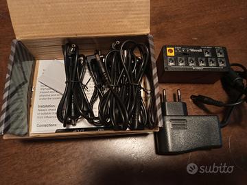 con 6 uscite 9 V 100 mA, una 9V 500 mA e una a scelta tra 12 V e 9 V 300 mA selezionabile da switch. Totale 18 W per una catena effetti completa. Dimensioni piccolissime !