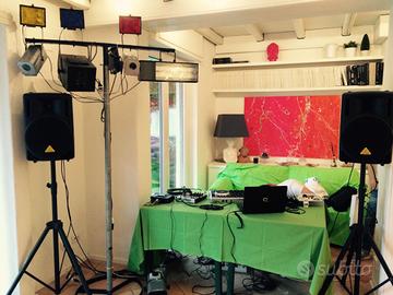 Allestimento completo ideale per feste private compleanno party capodanno o halloween. Il kit descritto per una serata, è composto da: 3 fari 500w colorato con centralina. stroboscopica 1500w. Effetto colorato 350w. Macchina del fumo 700w. Asta supporto a "T". Pulsantiera di gestione e controllo. Cavetteria e prolunghe. Ideale per DJ o aspiranti DeeJay. Zona Roma Nord Ovest.