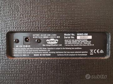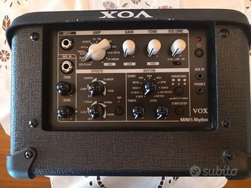 Causa inutilizzo vendo favoloso mini amplificatore della Vox. Un piccolo gioiello completo di tutto. Non è più in produzione, ma è ricercato per le sue particolari caratteristiche. Comodissima la doppia alimentazione, sia con alimentatore in dotazione che a pile. Comodo da portare con se in ogni occasione. Di seguito la descrizione: Il Vox Mini 5 Rhythm è un piccolo combo perfetto per esercitarsi e divertirsi con caratteristiche fantastiche. Prima di tutto il Mini 5 Rhythm funziona sia alimentato, sia con batterie AA (fino a 19 ore di autonomia). Inoltre le 11 simulazioni di amplificatori e gli effetti disponibili rendono disponibili tantissime sonorità. E per finire 99 track pre-caricate permettono di esercitarsi per suonare "in ensemble". • Tecnologia Solid State • Potenza 5W/1.5W/0.1W • Cono da 5" Vox Custom Voiced • 11 simulazioni di amplificatori • 4 effetti digitali • 4 modulazioni e delay • Controlli: Gain, Tone, Master Volume • Funzioni Tap e Bypass • Accordatore cromatico • 99 track su cui suonare • Entrata Aux In e microfono (con controllo volume) • Uscita per cuffia • Alimentatore incluso Tel. 3494206273
