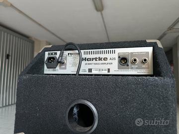 Vendo piccolo combo basso Hartke da 25 watt, speaker da 8". Ingresso jack, aux, uscita DI e effects send/return. Perfetto per suonare in casa. Mantenuto in sala non fumatori, no umidità. Funziona perfettamente. Consegna a mano zona mestre.
