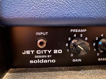 Vendo testata valvolare per chitarra elettrica 20w Jet City 20 by Soldano con cassa 2x12 Jet City JCA24S con coni Eminence. Acquistato il tutto nel 2011, funzionante e disponibile a qualsiasi prova. Qualche normale segno sulla cassa dovuto al trasporto. Vendo per inutilizzo. Non vendo separatamente. Consegna a mano zona Trento.