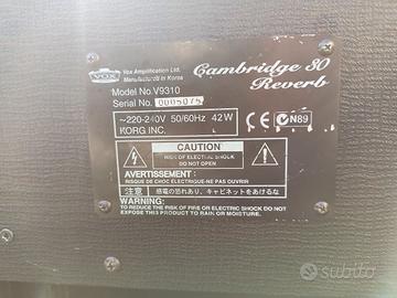 VOX Cambridge 30 Reverb. Anno 1999. Combo con pre valvolare con una 12AX7 e finale integrato, 30 watt RMS, cono Celestion da 10”, più che sufficienti sia in sala prove che su di un palco.