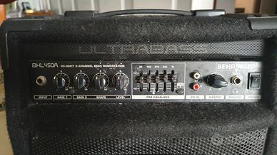 amplificatore per basso Behringer Ultrabass BXL 450A con cono in alluminio Bugera, equalizzatore a 5 bande, due canali (lineare e distorto con controlli shape, gain e level,), ingresso aux, uscita cuffia. Potenza 45w reali, suono potente e pieno grazie al processing ultrabass, ottimo per studio e performance indoor, peso 14 kg circa. qualsiasi prova, vendo per inutilizzo.