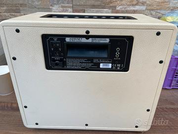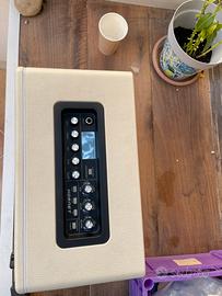 Potenza: 30 Watt RMS Configurazione altoparlanti: 1x Custom 8" (8 Ohm) 9 repliche digitali di alta qualità di amplificatori popolari per chitarre elettriche 3 effetti di modulazione selezionabili (chorus, phaser e vibrato) 3 tipi di ritardo selezionabili (analogico, eco a nastro e digitale) 3 tipi di riverbero selezionabili (Room, Hall e Church) 2 modalità di lavoro (Live / Preset) Ingresso tap tempo indipendente per effetti di modulazione e delay Sintonizzatore integrato 9 preset utente Connessione Bluetooth wireless e ingresso AUX per la riproduzione multimediale Controlli per guadagno, alti, medi, bassi, volume, modulazione, ritardo e riverbero Interruttore rotante a 9 vie per selezionare il modello dell'amplificatore Pulsanti di controllo per Live/Preset, M.Tap, D.Tap, BT e Tuner display a LED Ingresso strumento jack mono da 6,3 mm Uscita cuffie jack stereo da 3,5 mm Ingresso AUX jack stereo da 3,5 mm Alimentazione tramite alimentatore da 24 V CC incluso con connettore a barilotto da 2,1 x 5,5 mm, polarità (-) interna Consumo energetico: circa 2.000 mA Dimensioni (L x A x P): 340 x 295 x 203 mm Peso: circa 4,0 kg Copertina: Tolex bianco
