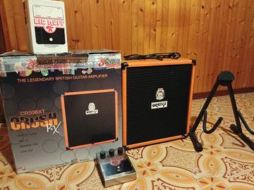 Amplificatore combo per basso elettrico Orange Crush Bass 50 Watt, finitura arancione classica, accordatore cromatico integrato, ingresso Aux per basi musicali e uscita cuffie. Distorsore per chitarra Big Muff, classico pedale made in NYC con manopole per Volume, Tono e Sustain. Poggiachitarra Quick Lock ad "A" richiudibile adatto per chitarra sia acustica che elettrica grazie alla parte inferiore dei sostegni sagomata, struttura robusta in metallo con finiture protettive. Prezzo in blocco €180 Solo amplificatore €160 Solo pedale €25 Solo poggiachitarra €15 Contattare al +39 335 109 0967 Manuela, solo nel pomeriggio oppure WhatsApp