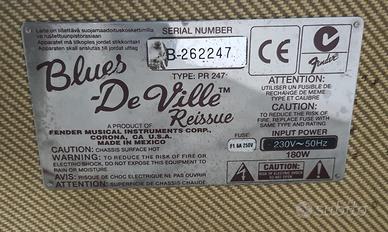 Amplificatore Fender. Blues Deville reissue 4x10 valvole 6L6. Ottimo suono pulito e brillante, bassi profondi.Pedaliera per la selezione del canale lead e reverbero.