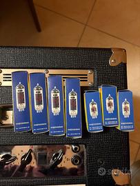 Vendo come da titolo Laney vc 30 2x10, Made in U.K. Seriale LTA1138. Monta 2 coni jensen da 10, Made in Italy, ha un suono da paura, sia sui puliti che con il distorto, ha ingresso Hi o Low, in base se si suona in casa o fuori, tasto bright per un suono più cristallino, due potenziometri per regolare il volume del clean o del drive, più le regolazioni classiche. È stato completamente rivalvolato con JJ Tesla EL 84 ed ECC 83. Riparato il riverbero originale a molla. Vendo a malincuore per inutilizzo, in regalo footswitch Laney originale più cover di pelle nera. Prezzo trattabile. Niente scambi. Si preferisce consegna a mano, disposto a spedire senza nessun problema. Prezzo trattabile!