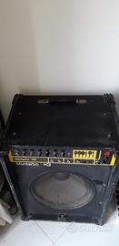 amplificatore per basso elettrico con equalizzatore incorporato, dotato di tre maniglie (due laterali e una superiore) ruote posteriori e pannello per chiusura frontale.