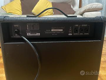 Amplificatore per basso Eko, 25watts-80Ohm. L’ho utilizzato molto poco e solo in ambito domestico, non presenta alcun segno di usura/ammaccatura, la misura è 37x37cm, il suono è nitido.