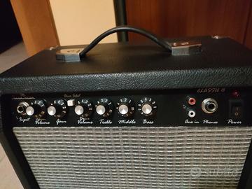 vendo amplificatore marca "Sound station", modello "Classic 15", da 15 Watt di potenza, con entrata cavo chitarra, pulsante per suono pulito-distorto, gain, volume, medi, bassi e alti. Entrata aux e microfono.