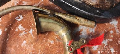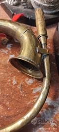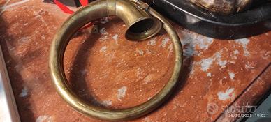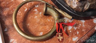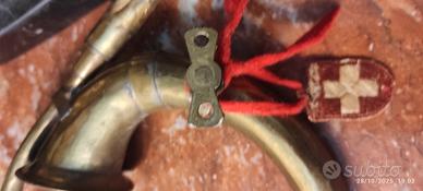 Tromba da carrozza antica, realizzata in ottone. Presenta un ciondolo con la bandiera svizzera e nappe rosse.