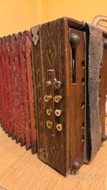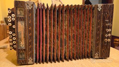 vendo splendido e raro organetto diatonicod'epoca, pezzo di storia dell'artigianato italiano prodotto dalla celebrePremiata Fabbrica di Armoniche Comm. Paolo Soprani & Figlidi Castelfidardo. Lo strumento è un autentico oggetto da collezione che conserva tutto il fascino del tempo. Caratteristiche principali: Marca:Paolo Soprani (fondatore dell'industria della fisarmonica in Italia). Tipologia:Organetto diatonico a bottoni. Estetica:Cassa in legno riccamente decorata con intarsi geometrici e floreali originali. Mantice:Mantice d'epoca con carta decorata a motivi floreali e rinforzi in tessuto rosso, in buone condizioni estetiche. Dettagli:Etichetta originale d'epoca protetta da vetro ancora perfettamente leggibile. Bottoni in madreperla/osso originali. Lo strumento si presenta inottime condizioni esteticheper la sua età, con la patina originale che ne testimonia l'autenticità. Non è stato testato a livello meccanico/musicale recente, pertanto viene venduto comeoggetto d'antiquariato, da esposizione o per eventuale restauro conservativo.