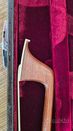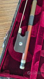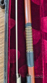 Archetto alla francese 3/4 per contrabbasso, in pernambuco, sezione ottagonale, rana in ebano con inserti in madreperla, condizioni pari al nuovo, leggerissimo, molto ben bilanciato, con custodia rigida (interni in velluto perfetti, esterno da rifoderare).