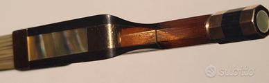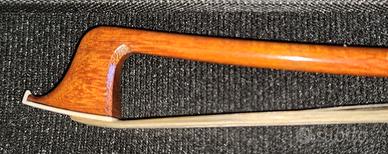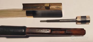Cedo archetto per violino 4/4 prodotto nell' 88 dal Maestro Archettaio Giovanni Lucchi di Cremona e da lui stesso restaurato, dal quale lo acquistai direttamente presso il suo laboratorio, (bacchetta in pernambuco, montato in oro, ebano, madreperla e avorio, con un peso di g 59,00). L'archetto è della serie da concerto prodotta dal Maestro Lucchi , con caratteristiche meravigliose, bacchetta con curvatura e asse perfette. L'archetto è sempre stato conservato nella propria custodia in ambiente ad umidita' e temperatura controllata, e in assenza di tensione. Inoltre e' appena stato sottoposto ad un controllo completo, pulito e revisionato (marzo 2026) direttamente nel laboratorio della LUCCHI Cremona, dal Maestro Massimo (figlio di Giovanni) con la sostituzione della scarpetta in avorio, della pelle sull'impugnatura e la reincrinatura con I crini LucchiSpecial. (nonostante i crini furono sostituiti poco prima di smettere di suonare nel 1994, e conservati puliti e in assenza di tensione). Ho ritenuto opportuno far eseguire questo controllo totale, manutenzione e pulizia visto il pregio di questo archetto. E' corredato da certificato di autenticita' della LUCCHI CREMONA. con una quotazione commerciale attuale che si attesta tra i €4000,00 e €6000,00 , cedo a € 5000,00 Se interessati invio altre foto. Disponibile ad offerte e trattative congrue. In caso di Spedizione , si effettuerà solo con corriere assicurato per il valore intero (costo a parte).