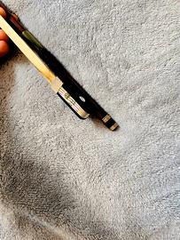 Prezzo da affare, pagato quasi il doppio presso liutaio rinomato. Arco tedesco da violoncello fatto da R. Paesold. Bacchetta in Pernambuco, nasetto in ebano, anello e vite in argento, scritta madre perla Ottimo stato, tenuto sempre senza tensione, a parte durante il suo uso, quindi con ottima curvatura. Crini in ordine. Peso: 82 gr Livello studente intermedio / avanzato Ritiro di persona a Milano o spedizione da concordare.