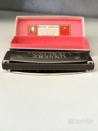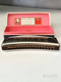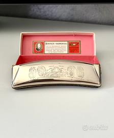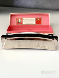 Uno dei modelli più iconici e longevi della M. Hohner, l'azienda tedesca leader mondiale nella produzione di armoniche: il "Unsere Lieblinge" (che in tedesco significa "Le nostre preferite"). • Condizioni: L’armonica si trova in ottime condizioni, presenta solo qualche minimo segno esteriore dato dal tempo trascorso dalla sua produzione. È inclusa la sua scatola. • Tipo: È un'armonica a ottave. A differenza delle classiche armoniche blues (diatoniche), questa ha due file di fori. Ogni coppia di fori verticali produce la stessa nota, ma accordata a un'ottava di distanza. Il risultato è un suono pieno, ricco e vibrante, molto simile a quello di una fisarmonica. È perfetta per la musica folk, i canti popolari e le melodie tradizionali. • Design: La caratteristica forma curva (a "banana") è pensata per essere ergonomica e seguire il movimento naturale delle labbra. • Caratteristiche storiche: L'interno del coperchio cita premi vinti a Philadelphia (1926), Ginevra (1927) e Parigi (1937), quindi trattasi di un modello prodotto dopo il 1937. • Provenienza:"Made in Germany" (Trossingen). • Tonalità: Sull'estremità destra dell'armonica è incisa la lettera "C”, significa che è in tonalità di Do maggiore, la più comune e versatile. • Materiali: Il corpo interno (il "pettine") è solitamente in legno d'acero, che contribuisce al calore del suono, mentre le coperture esterne sono in acciaio inossidabile cromato. #armonica #armónicahohner