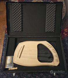 Lirarpa cromatica Auris, fatta a mano. Usata poche volte. Una corda va sostituita. Vendo con valigia per trasportarla, chiave per accordare e amplificatore nuovo, mai usato.